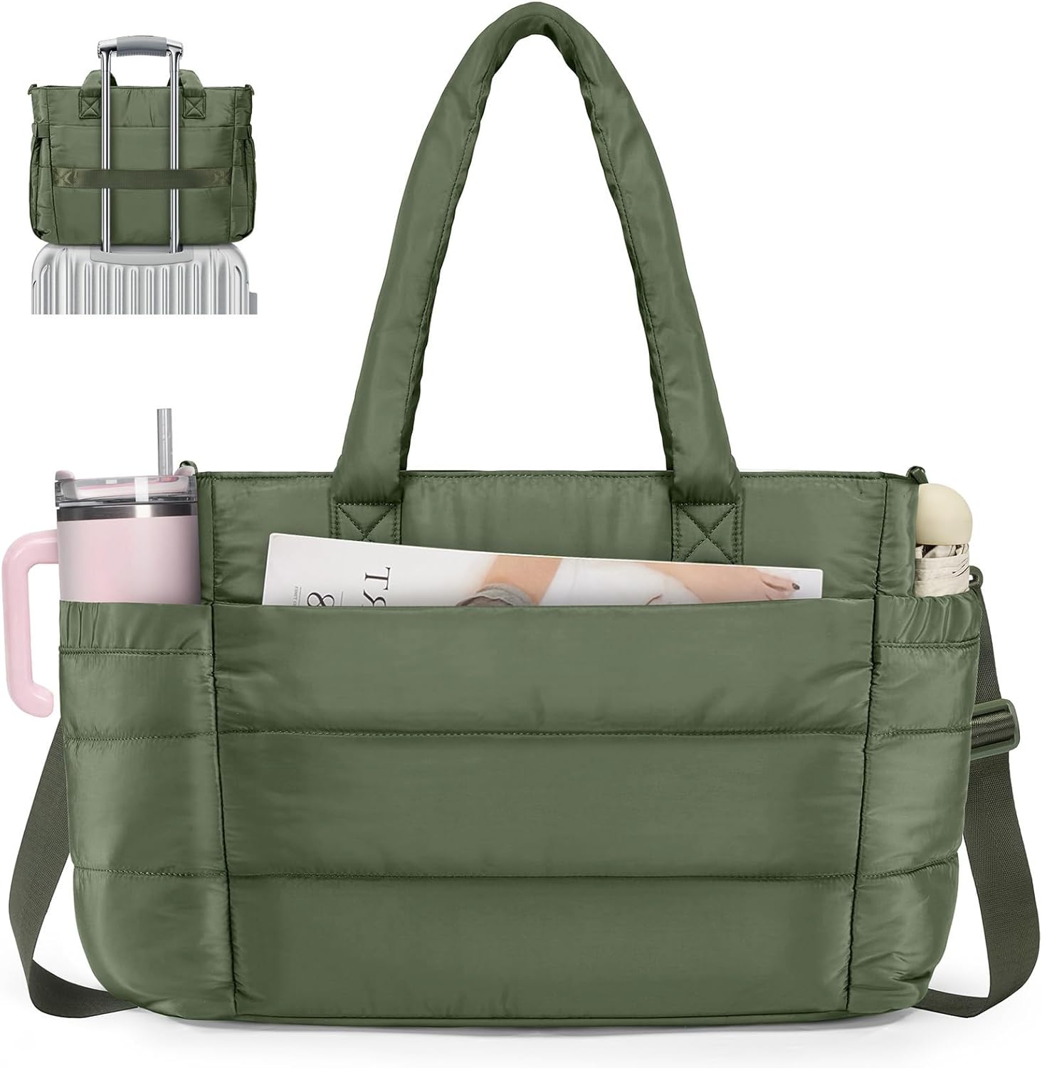 RAINSMORE Tote Bag for Women with Cup Holder, Puffer Work Bag, 15.6 inch Quilted Laptop Handbag for Work, Travel, Teacher