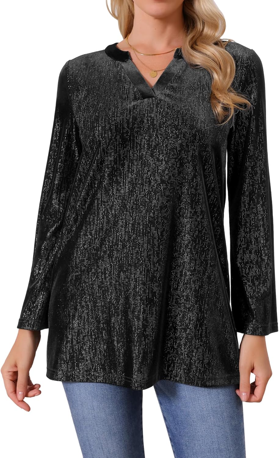 Seta T Women's Glitter Velvet Top V Neck Long Sleeves Sparkle Tunic Velour Blouse Loose Party Shirt