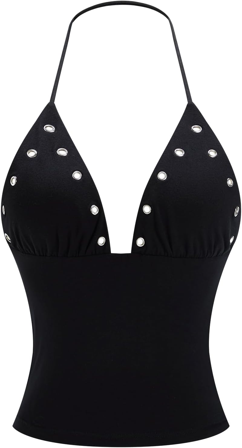 Women's Y2k Backless Halter Top Grommet Eyelet Deep V Neck Party Club Tops Streetwear