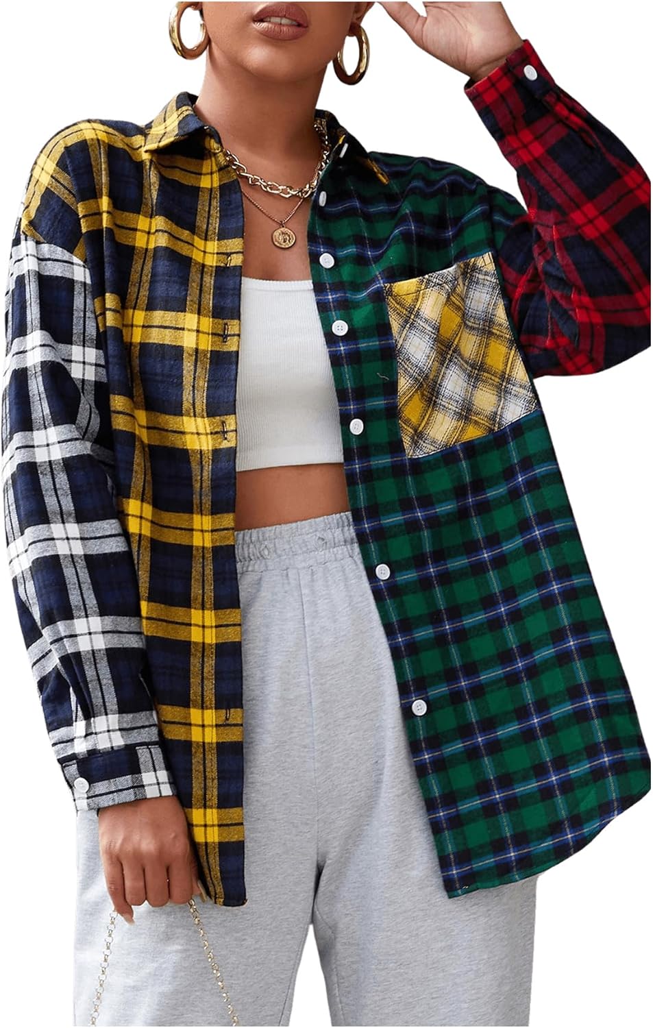 Floerns Women's Tartan Color Block Long Sleeve Plaid Button Down Blouse