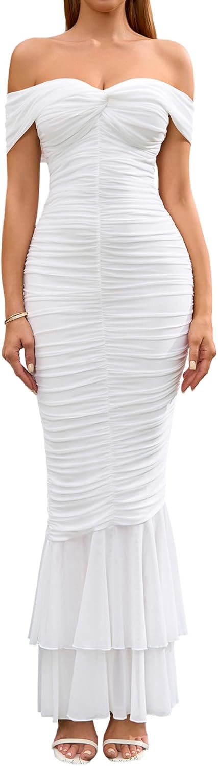 Off Shoulder Maxi Dress for Women Ruched Bodycon Formal Wedding Guest Long Dresses