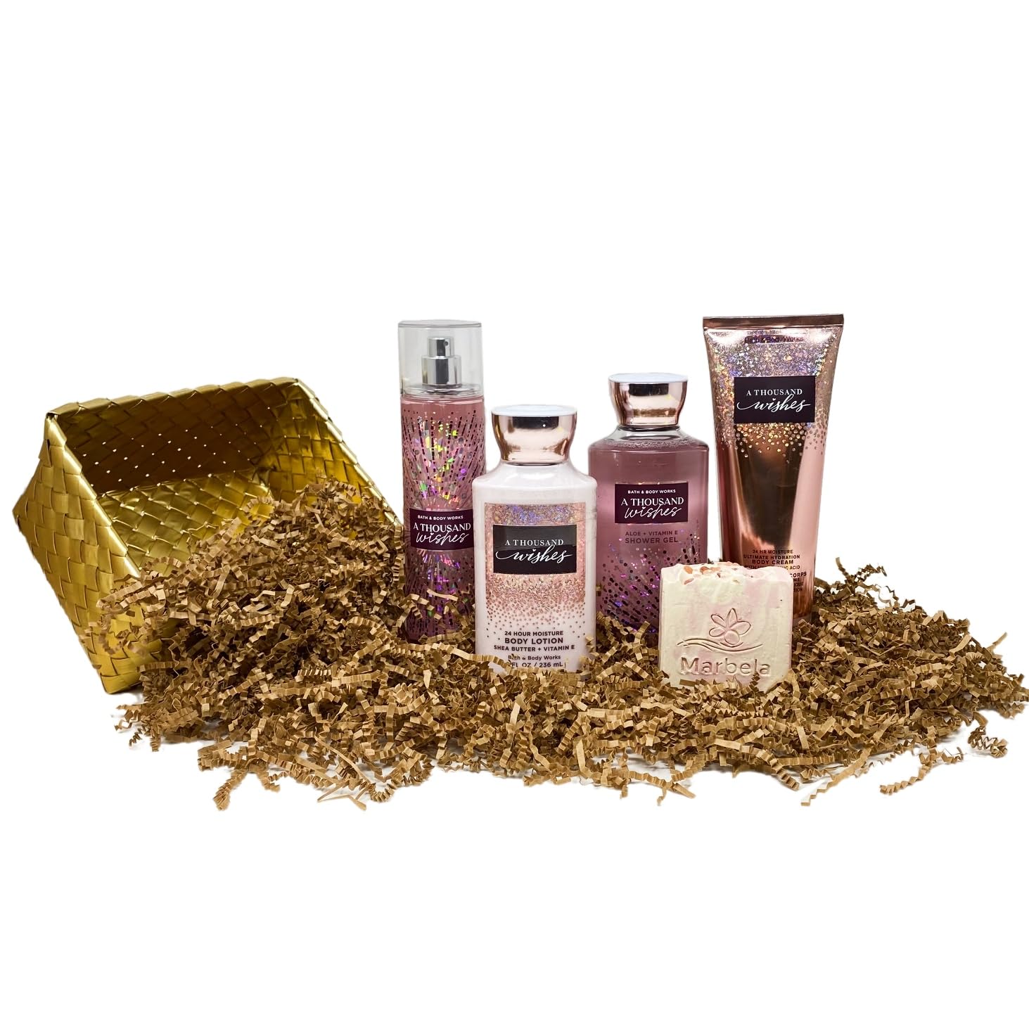 Bath & Body Works A Thousand Wishes Gold Woven Basket 4 Piece Gift Set - Fragrance Mist - Body Cream - Shower Gel - Body Lotion - with a Himalayan Salts Springs Bar Soap - Full Size
