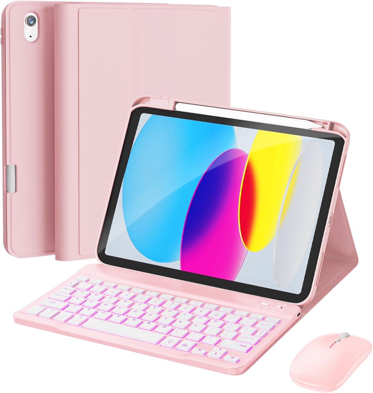 for iPad 11th (A16, 2025) / 10th Generation Case with Keyboard, Mouse and Detachable Wireless Keyboard, 7-Color Backlight, Slim Case with Pencil Holder, Light Pink