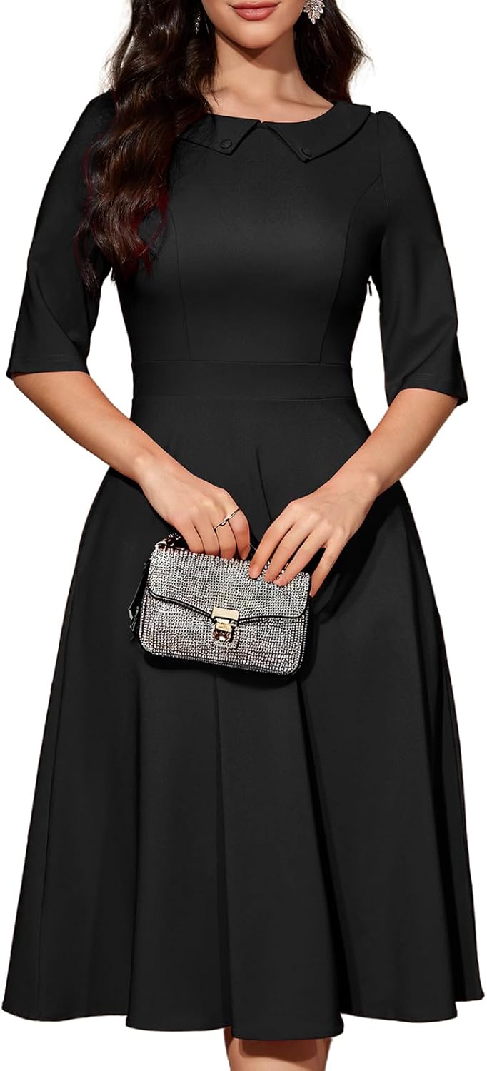 Bbonlinedress Womens Vintage Cocktail Dress Formal Spring Wedding Guest Church Long Sleeve Peter Pan Collar Midi Dresses