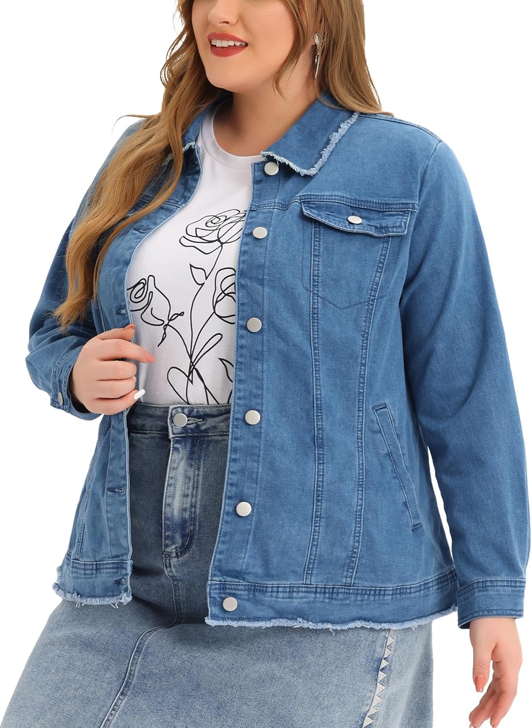 Agnes Orinda Plus Size Denim Jackets for Women Frayed Hem Classic Washed Jean Jacket