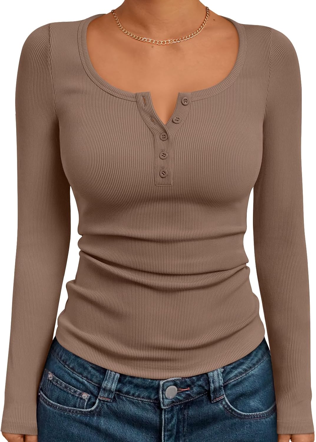 Trendy Queen Long Sleeve Shirts for Women Henley Ribbed Fall Tops Dressy Business Casual Teen Girl Winter Cute Basic Tees