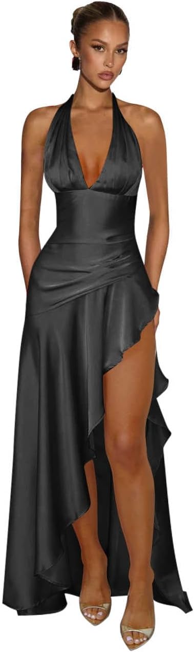 Satin Spaghetti Straps Prom Dresses with Slit for Women 2026 Halter Mermaid High Low Formal Ball Gown for Wedding