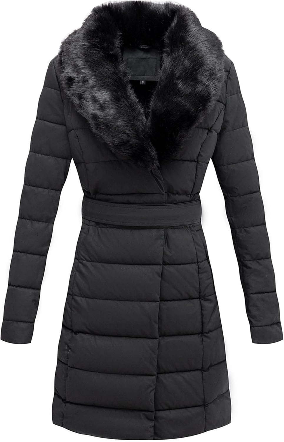 Bellivera Women's Winter Puffer Jacket Cold-Resistant Patchwork Plush Lining Coat with Removable Fur Collar Hooded and Belted