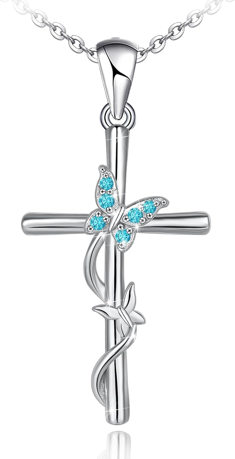 Distance Cross Birthstone Necklace for Women, 925 Sterling Silver Butterfly Cross Pendant, Birthstone Necklace Birthday Christmas Valentines Gifts for Her