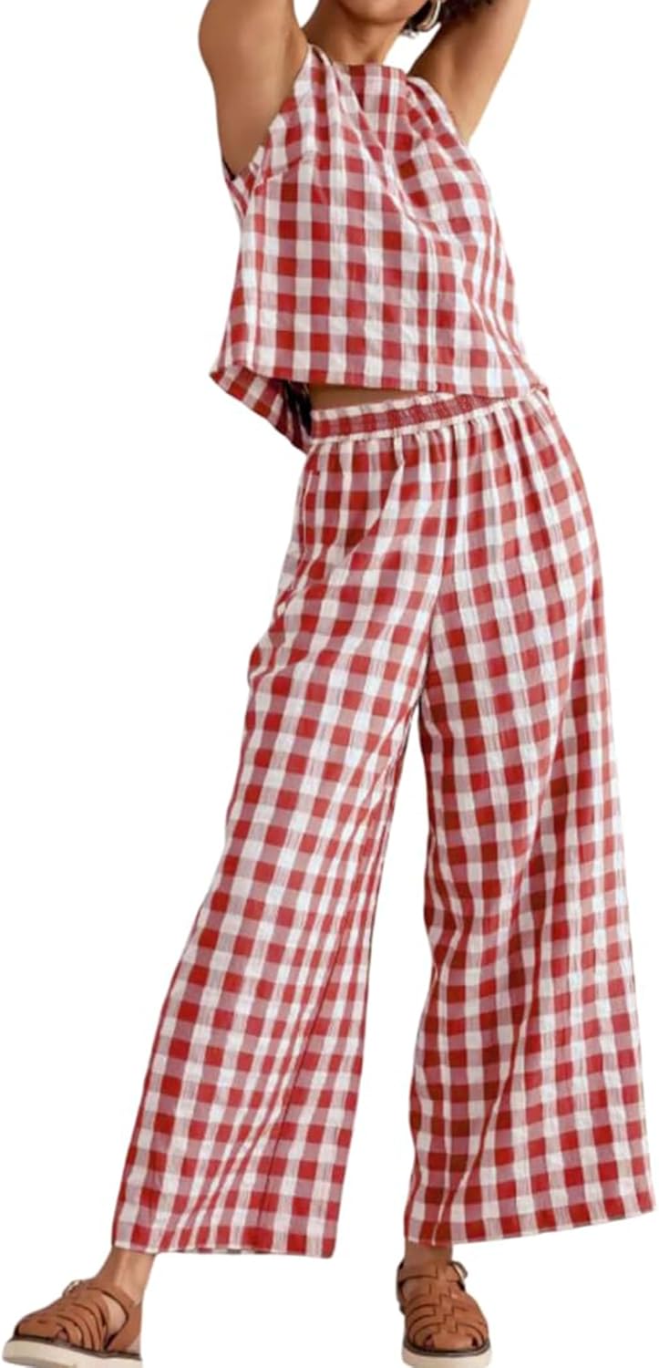 Womens 2 Piece Outfits Gingham Set Summer Cotton Plaid Pajamas Y2k Sleeveless Top Summer Wide Leg Pants Matching