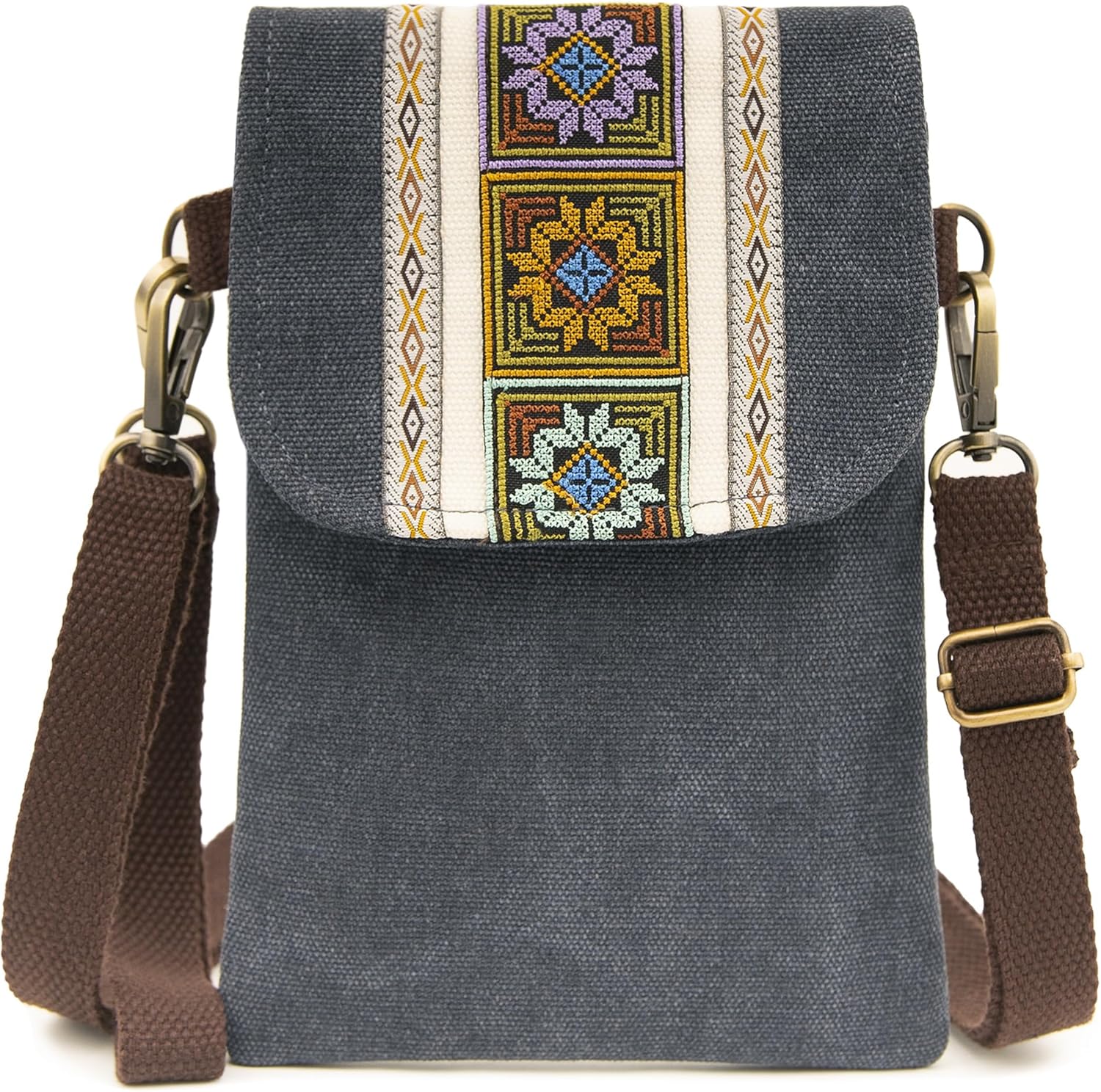 SILKAREA Vintage Embroidered Canvas Flip Small Crossbody Bag Cell Phone Pouch for Women Wristlet Wallet Bag Coin Purse