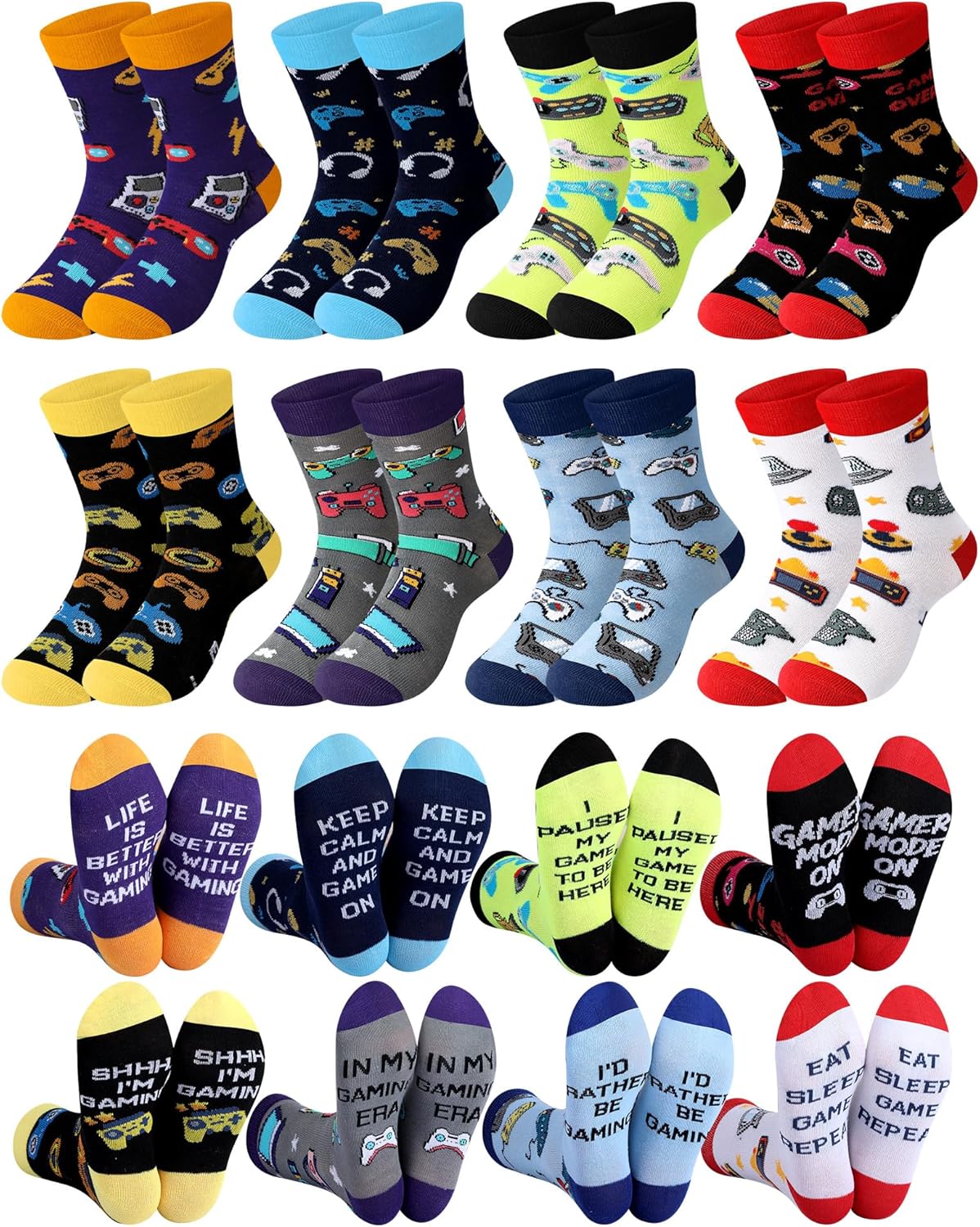 8 Pairs Gaming Socks for Teen Boys Game Themed Cotton Crew Socks Birthday Gifts for Game Lover Party Favors