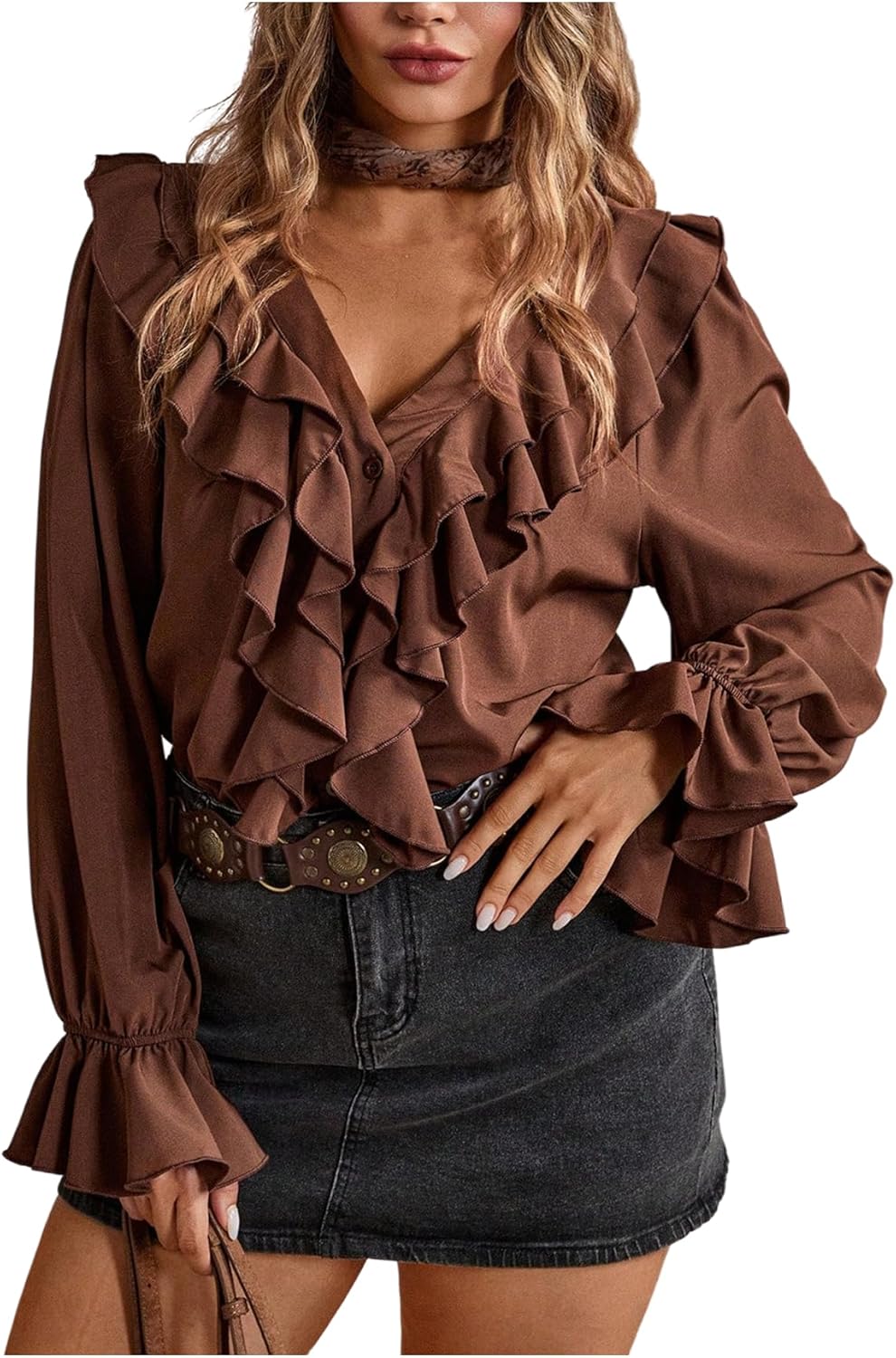 WDIRARA Women's Plus Size Layered Ruffle Button Down Shirts V Neck Flounce Long Sleeve Blouse Tops