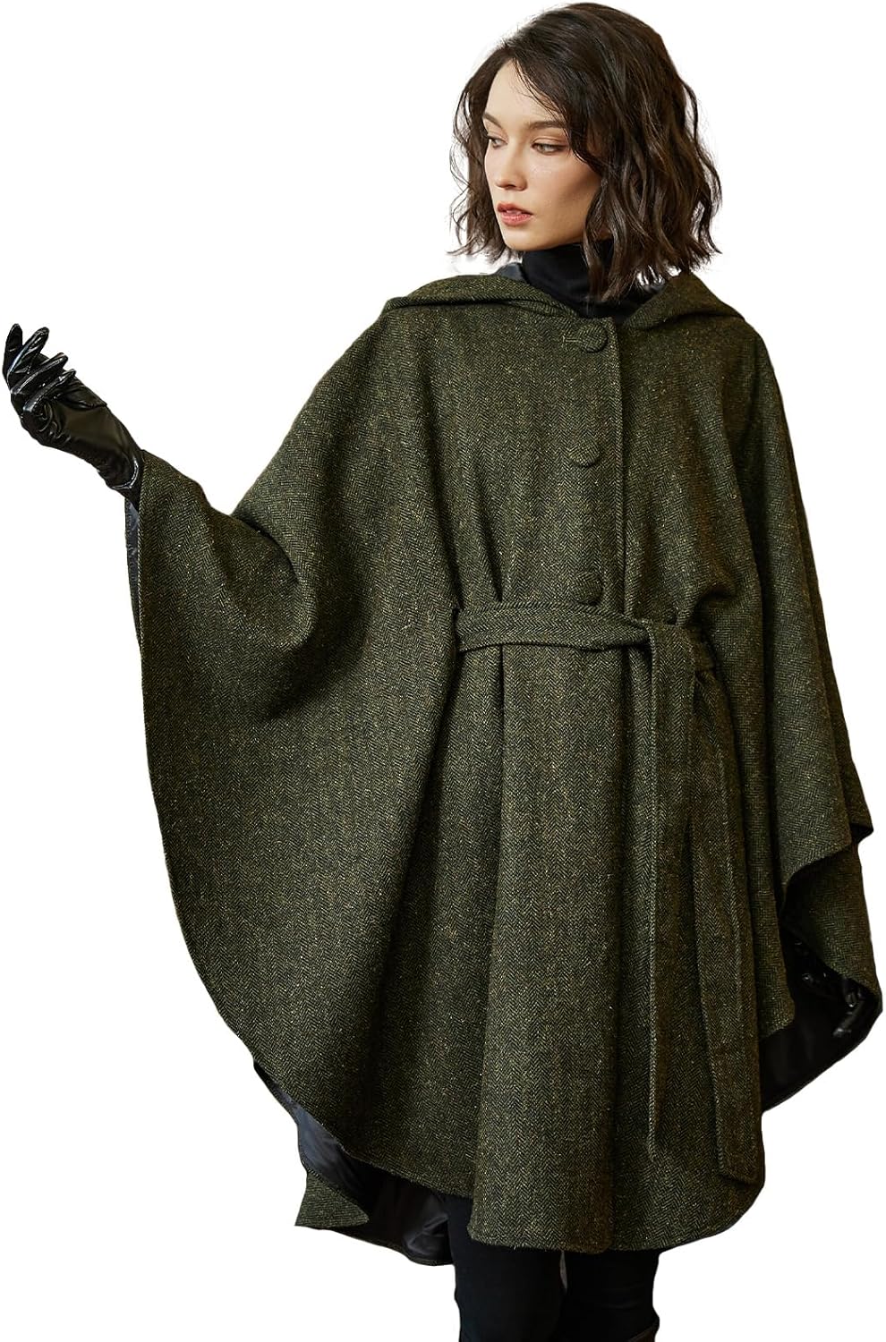 BEAUTELICATE Women Tweed Hooded Belted Cloak Buttons Closure Sleeveless Satin Lining Wool Poncho