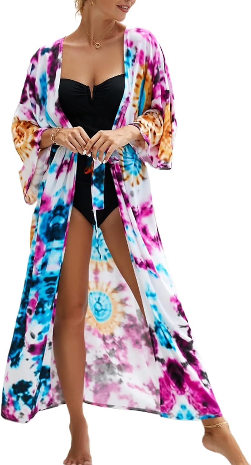 Women Tie Dye Kimono Cardaigan Loose Lightweight Summer Boho Open Front Caftan Sleeve Long Beach Cover Up