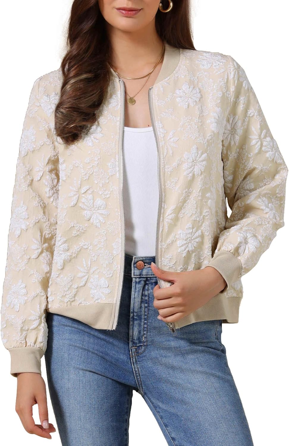 Allegra K Floral Bomber Jacket for Women Casual Zip Up Coats Spring Lightweight Windbreaker Outwear