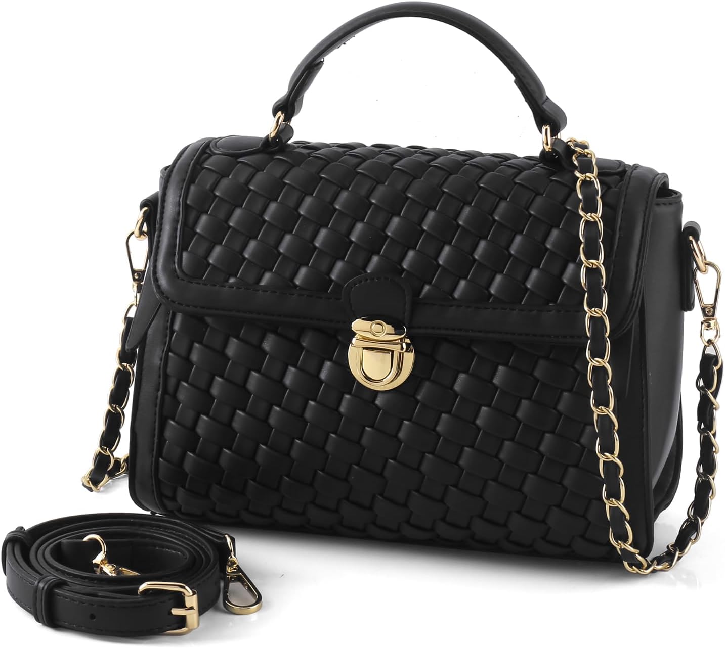 Woven Purses For Women Crossbody Bag Vegan Leather Hand Woven Handbag Shoulder Bag Top Handle Satchel Zip Cross Body Purse (Black)