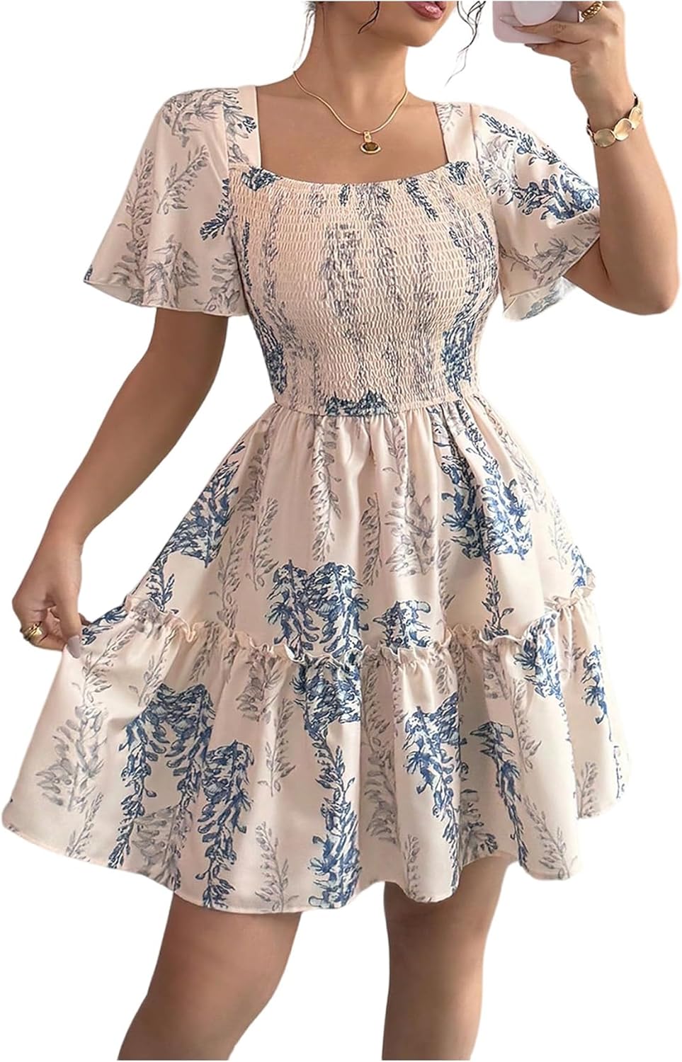 Floerns Women's Floral A Line Mini Dresses Square Neck Short Sleeve Summer Dress