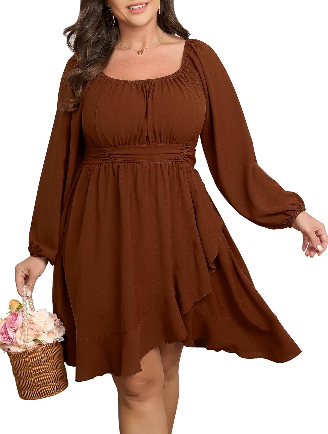 SCOMCHIC Women Plus Size Fall Dresses Long Sleeve Square Neck Ruffle Hem Flowy A-Line Cocktail Wedding Guest Mini Short Dress