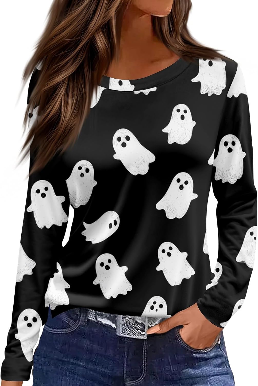 Halloween Shirts for Women Long Sleeve Crewneck Casual Dressy Tops Funny Graphic Halloween Costumes Fall Fashion Outfits