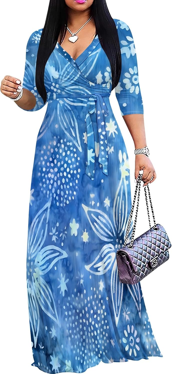PinkPatty Plus Size Maxi Dresses for Women Casual Flowy Long Dress 3/4 Sleeve V Neck Wrap Dress with Belt
