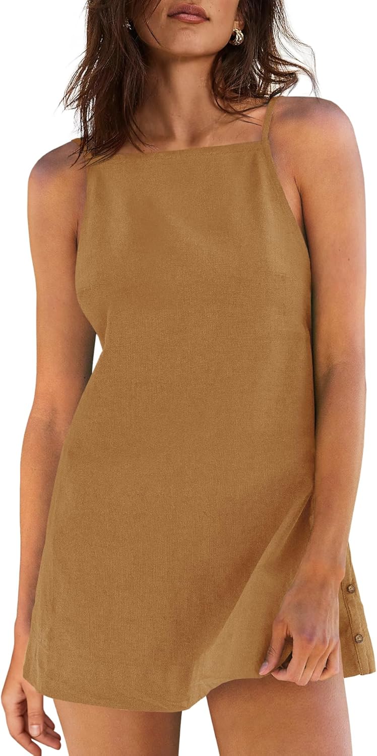 Yanekop Womens Linen Mini Dress Spaghetti Strap Short Beach Summer Dresses Sleeveless Sundress Open Back Dress