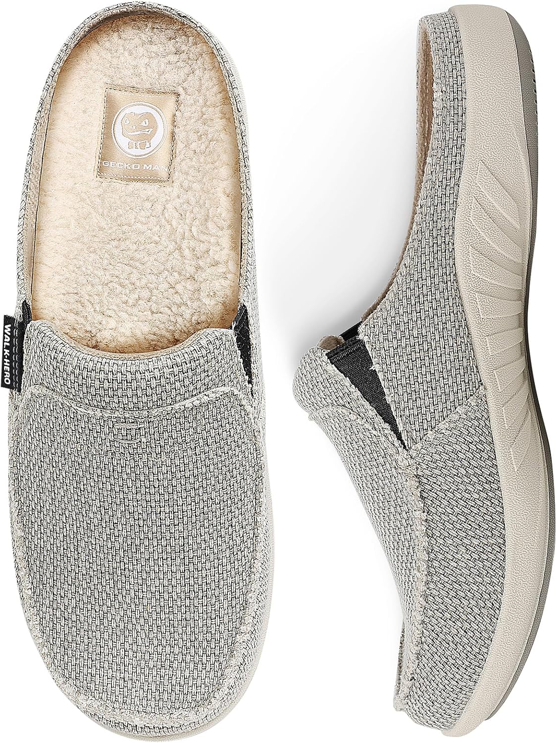 Mens Slippers with Arch Support, Canvas House Slipper for Men with Velvet Lining, Slip On Clog, Indoor Outdoor House Shoes with Anti-Skid Rubber Sole