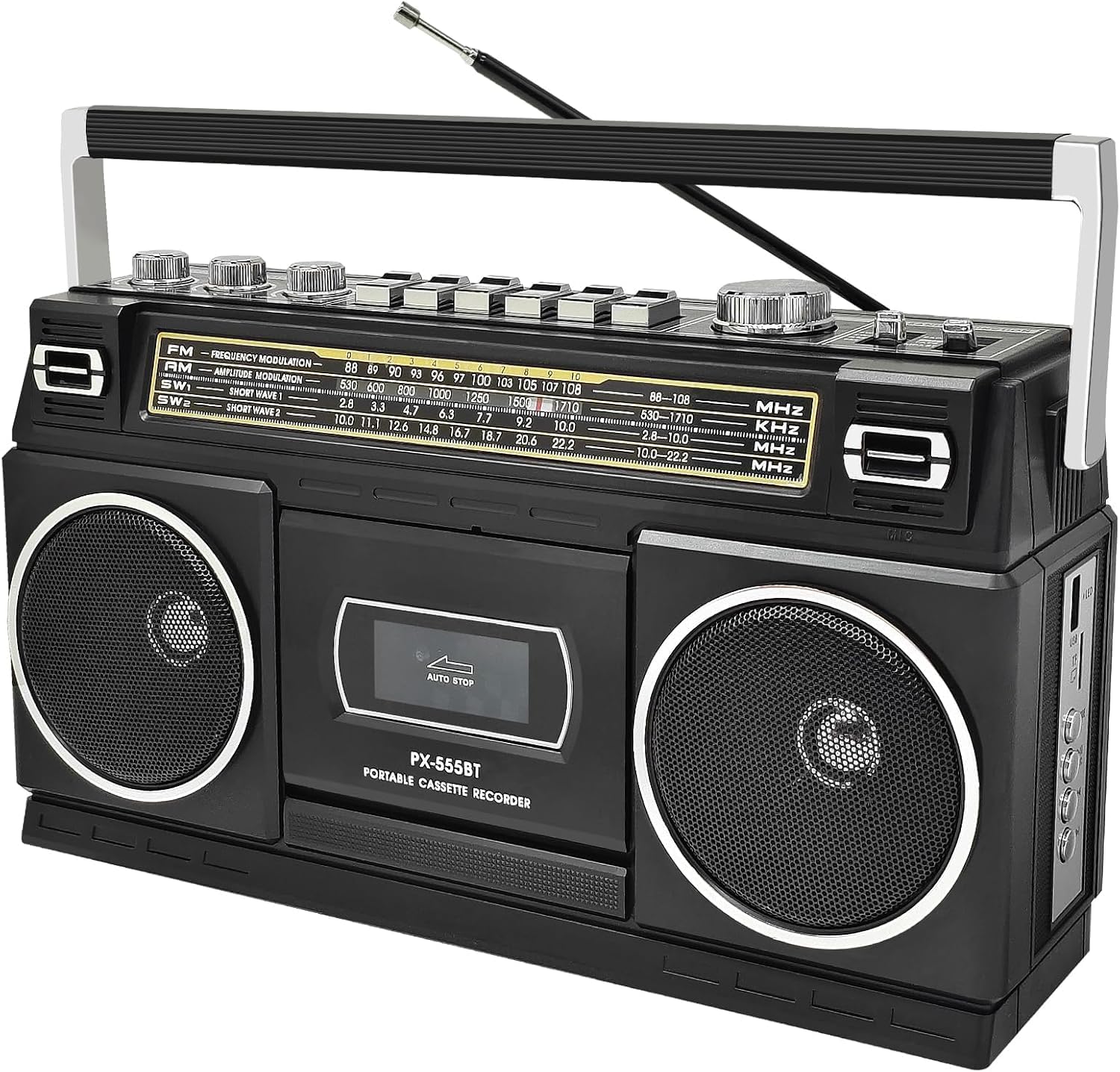 - 【All-in-One Retro Audio Center with Bluetooth & Radio】This versatile cassette boombox blends vintage charm with modern tech. Stream music wirelessly via Bluetooth, enjoy AM/FM/SW radio broadcasts, or play your classic tapes—all in a sleek, classic black design.