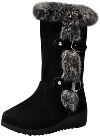 WENOREG Women's Suede Warm Mid Calf Snow Boots,Fashion Metal Buckle Furry Wedges Booties Outdoor Water Proof Anti-Slip Warm Plus Fleece Cotton Retro Winter Snow Tall Boots