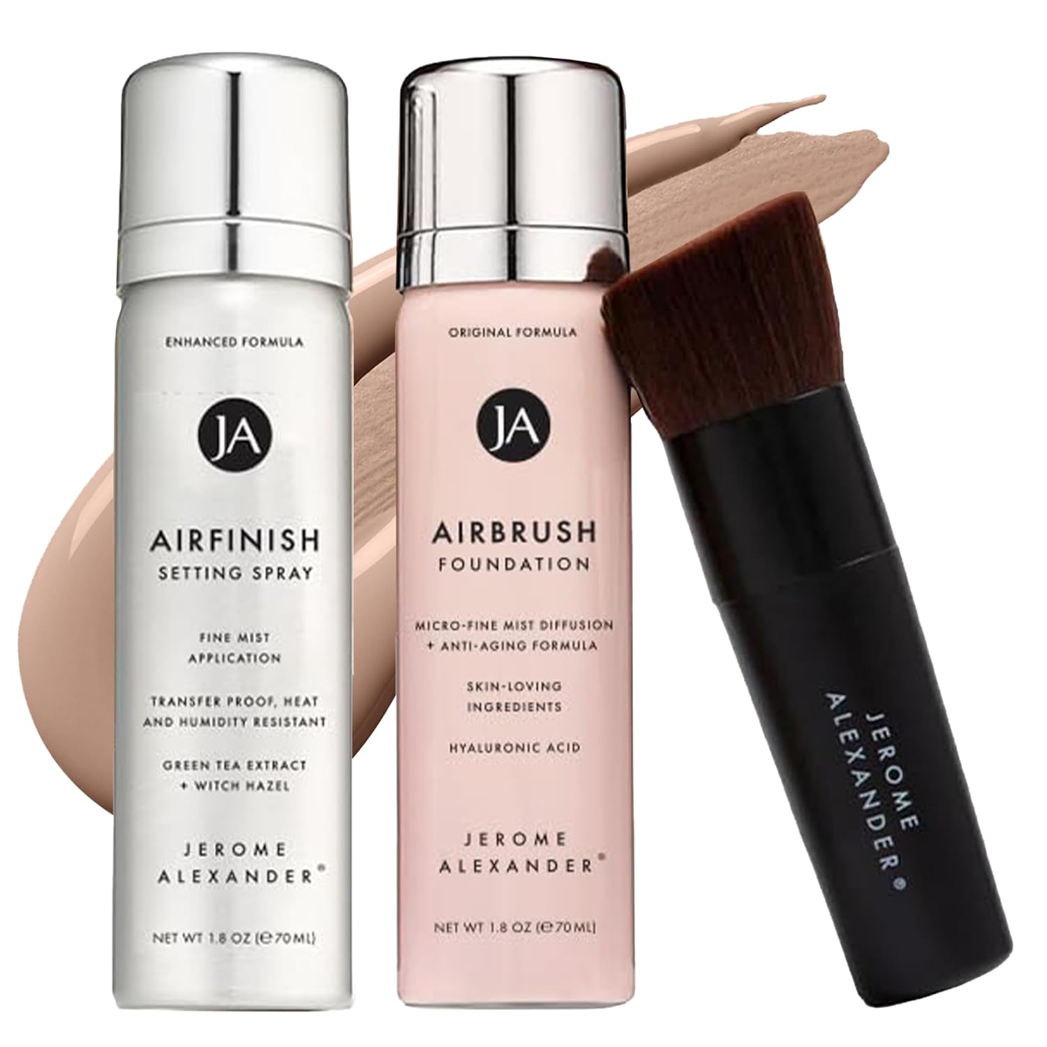 - COMPLETE AIRBRUSH SYSTEM: Achieve a flawless finish in minutes with this 5-piece set, including AirBrush Foundation Spray, LiquidSilk Air Primer, AirFinish Setting Spray, Kabuki Brush, and Slimline Kabuki Brush. Plus, enjoy the nourishing benefits of Jerome Alexander Skincare Makeup