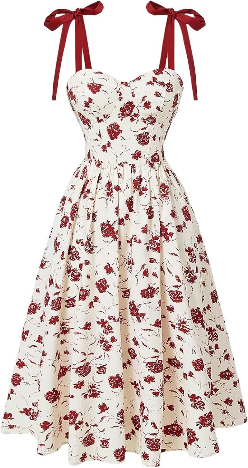 WDIRARA Women's Floral Print Tie Shoulder A Line Midi Dress Knee Length Flowy Dresses