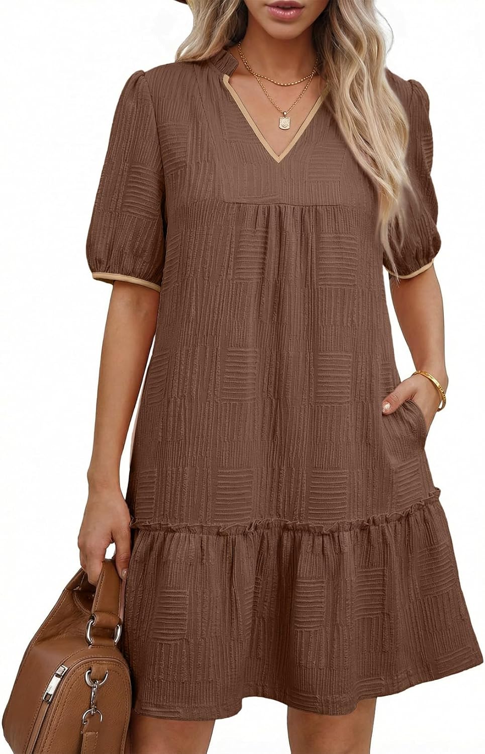 Dokotoo Summer Dresses for Women Casual V Neck Puff Short Sleeve Ruffled Solid Cute Babydoll Mini Dress with Pockets