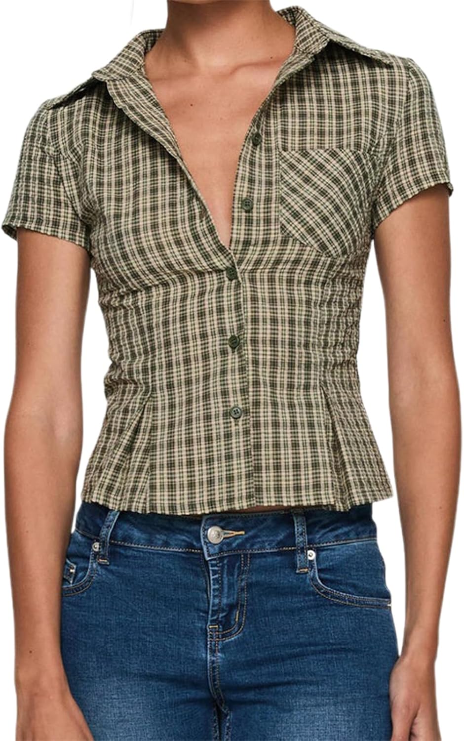 Women Y2K Plaid Button Down Shirt Coquette Short Sleeve V Neck Slim Fit Crop Top Vintage Coquette Blouses