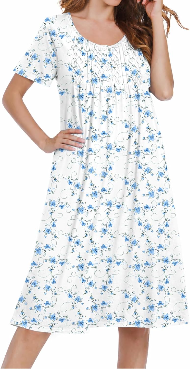 Ekouaer Cotton Nightgowns for Women Short Sleeve House Dress Pleated Night Gown Button Sleep Shirt Ladies Nightdress