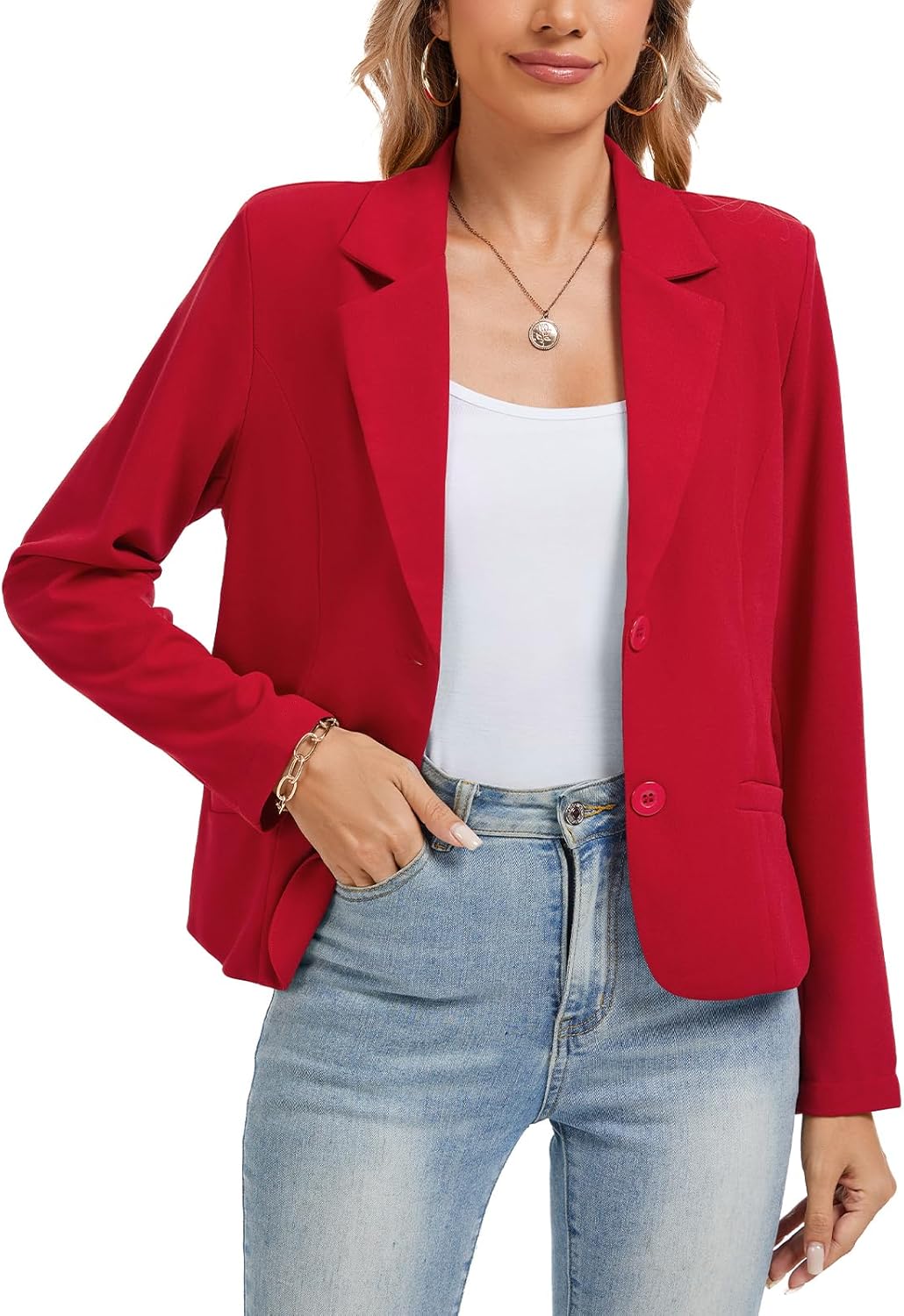 Women's Long Sleeve Blazers Casual Notched Lapel Work Padded Shoulder Button Front Blazer Jackets Pocket