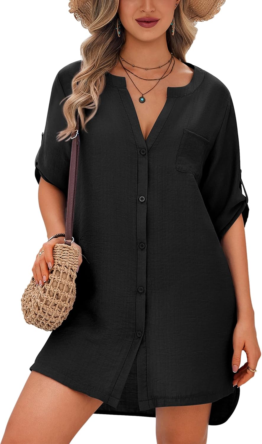 Ekouaer Bathing Suit Cover Up for Women V Neck Button Down Swimsuit Coverup Beach Dress Shirt S-3XL