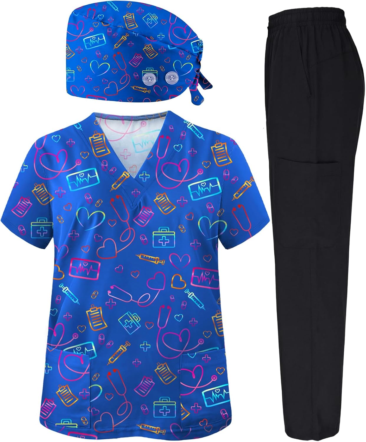 VillbeCoser 3Pcs Women's Scrubs Set with Scrub Pants Caps Cute Printed V Neck Tops Soft Casual Nurse Uniform With Pocket