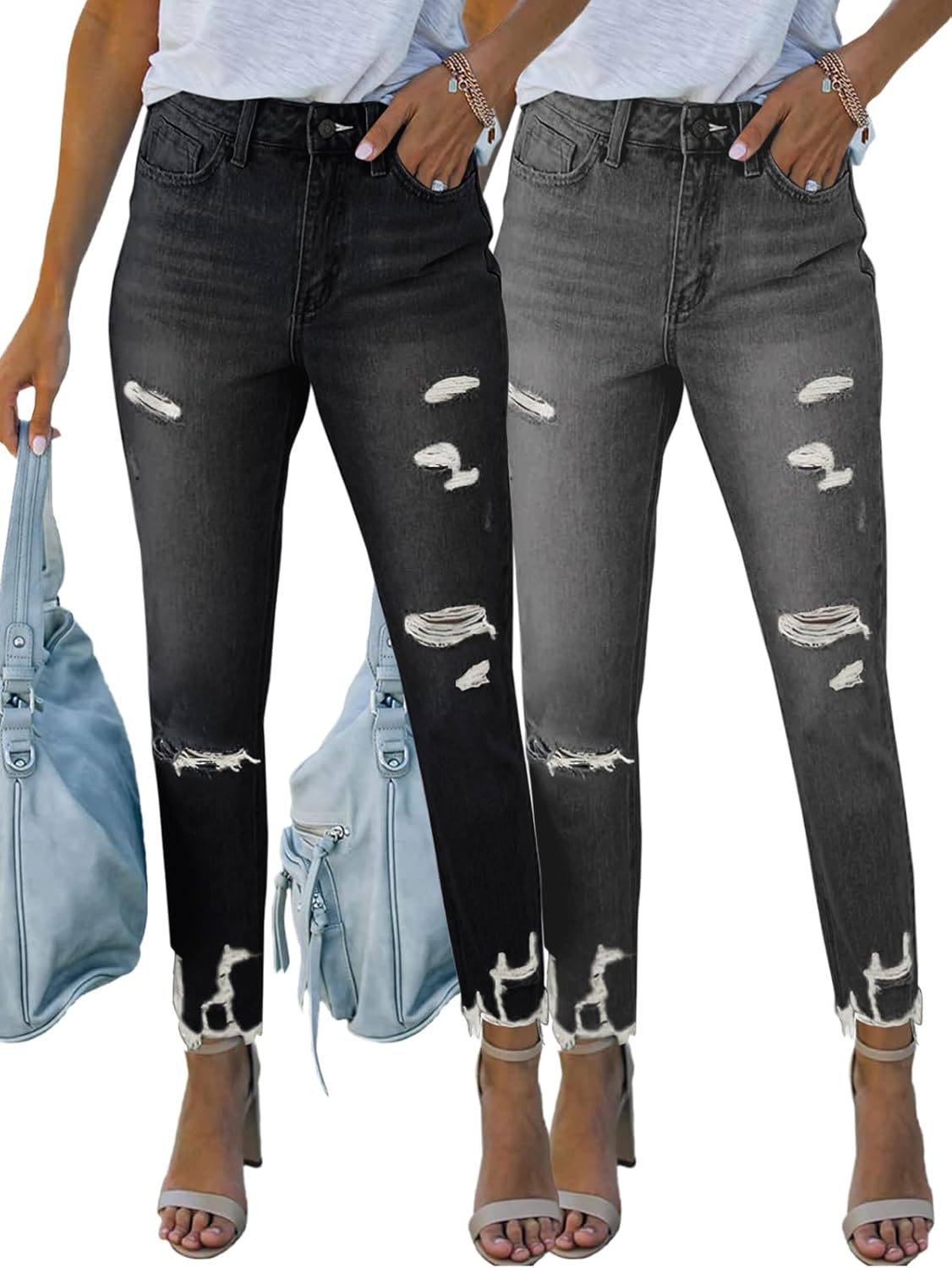 2 Pack Women's Mid Waisted Jeans Trendy Distressed Stretch Ripped Butt Lift Denim Pants Black&Grey X-Large