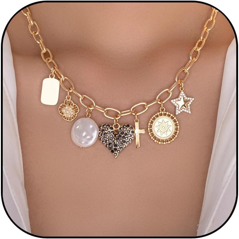 Gold Charm Necklace for Women Gold Cross Heart Necklace Dainty Rhinestone Heart Star Paperclip Chain Necklace Boho Jewelry Gifts